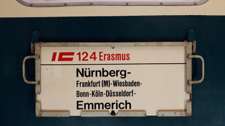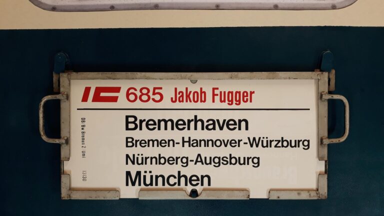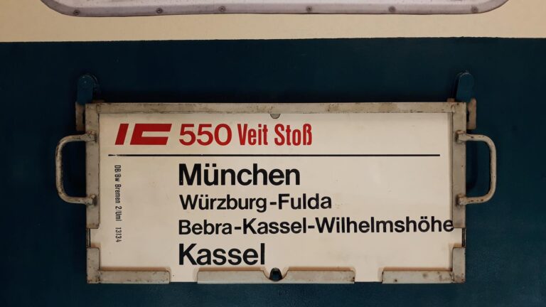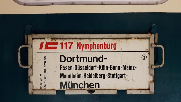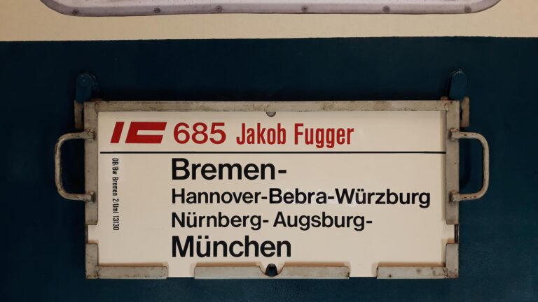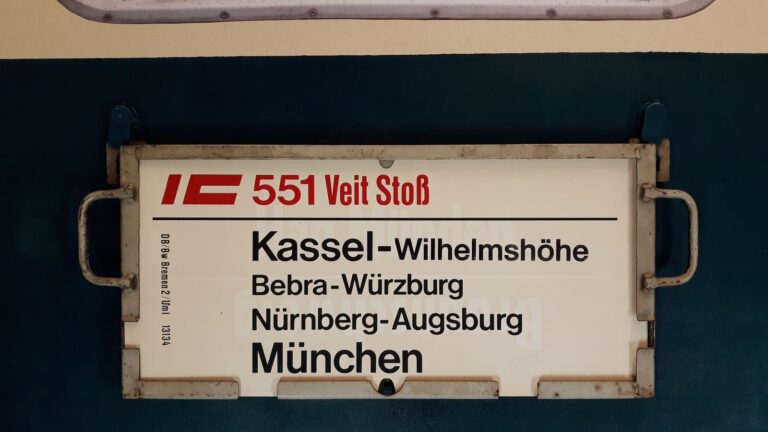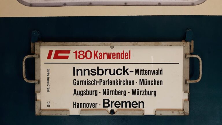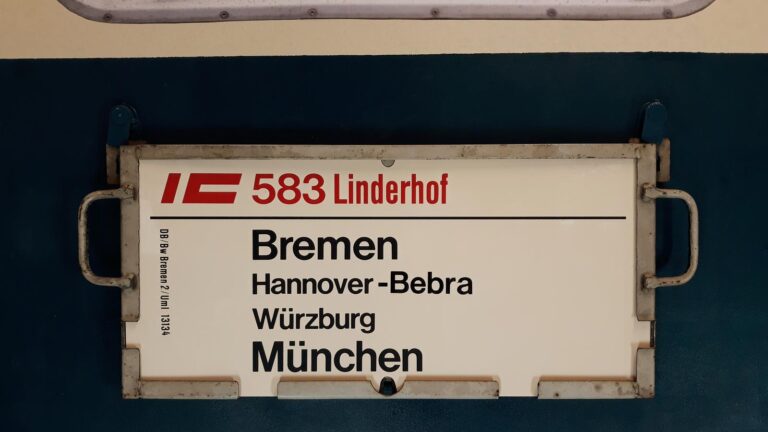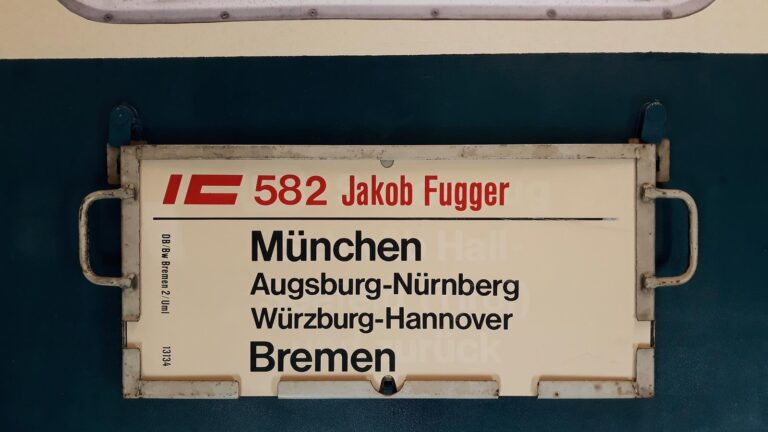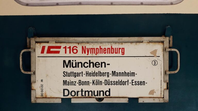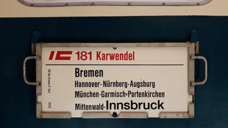 Bei diesem Zuglaufschild ist auch der Unterwegshalt Nürnberg aufgedruckt.
