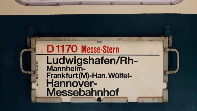 In diesem Zugschlaufschild ist ein Druckfehler zu finden…Dieser Messezug,der nur die erste Wagenklasse führte,startete vom 8.-15.3.1989 und vom 5.-12.4.1989 um 5.35 Uhr in Stuttgart,und hielt in Bietiheim,Bruchsal,Heidelberg,Weinheim,Darmstadt,Frankfurt Süd,Fulda und Hannover-Wülfel,bevor…