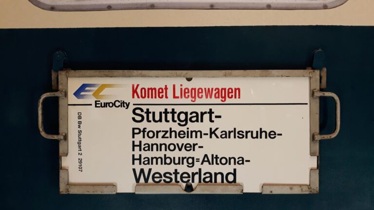 2003 stellte die Schweizerische Bundesbahn diesen namenlosen EuroCity.Man ging sorgsam mit diesen Zuglaufschildern um,denn auf der Seite des Schild war folgender Text aufgedruckt- „sofortige Rücksendung nach: Zürich 2852.“