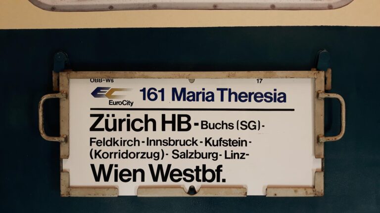 Der FD 264 Mozart als Stammstrecke von Wien nach Paris. Dieses Schild zeigt einen Kurswagen nach Port Bou, der aber erst Salzburg angehängt wurde. Ein Schild vom Sommer 1987, gestellt…