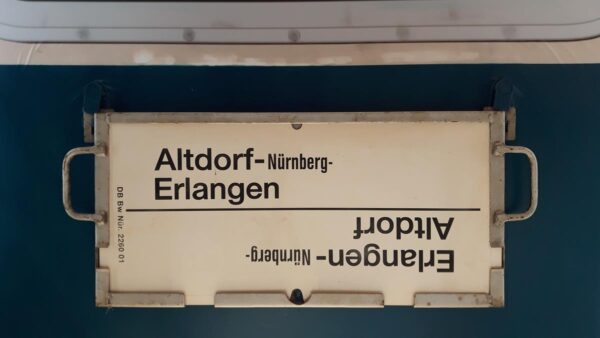 Erlangen-Altdorf Startseite Zuglaufschilder Nahverkehr Nahverkehrszüge Erlangen-Altdorf Das Betriebswerk Nürnberg stellte diesen Nahverkehrszug. Vorheriger Zuglaufschild EuroCity 73 Matterhorn Frankfurt(M)-Brig Nächster Zuglaufschild Osnabrück-Hannover