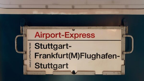 …ein Zuglaufschild das in Frankfurt Flughafen nicht auf die Rückfahrt umgesteckt werden musste,das Schild zeigt Hin-und Rückfahrt.