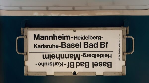 Basel Bad Bf-Mannheim Startseite Zuglaufschilder Nahverkehr Nahverkehrszüge Basel Bad Bf-Mannheim Das Betriebswerk Freiburg stellte diesen Zug. Vorheriger Zuglaufschild Diepholz-Münster Nächster Zuglaufschild Mannheim-Basel Bad Bf.