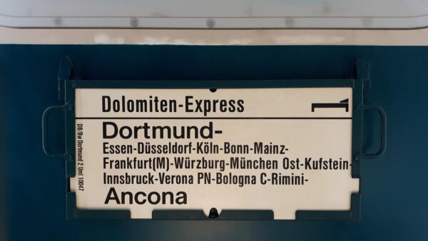 D 317 Britannia-Express Hoek van Holland-Merano/Meran Startseite Zuglaufschilder Besonderheiten Besonders lange Strecken D 317 Britannia-Express Hoek van Holland-Merano/Meran Das Schild hat Wind und Wetter gesehen und ist über 30 Jahre alt. Vorheriger Zuglaufschild Dolomiten-Express Dortmund-Ancona Nächster Zuglaufschild Brenner-Express München-Genova PP