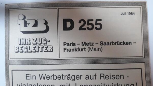 Startseite Zuglaufschilder Besonderheiten Zugbegleiter Faltblatt vorhanden IZB D 258 Frankfurt(M)-Paris