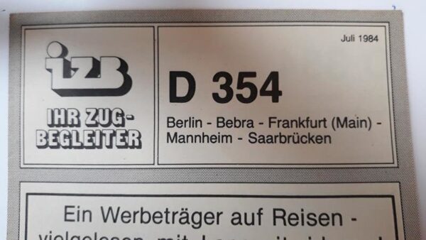 IZB D 349 Köln-Berlin Startseite Zuglaufschilder Besonderheiten Zugbegleiter Faltblatt vorhanden IZB D 349 Köln-Berlin Vorheriger Zuglaufschild IZB D 354 Berlin-Saarbrücken Nächster Zuglaufschild IZB D 348 Berlin-Köln