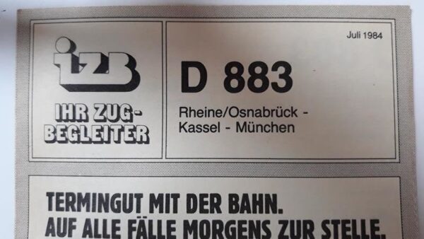 IZB D 892 Salzburg-Karlsruhe Startseite Zuglaufschilder Besonderheiten Zugbegleiter Faltblatt vorhanden IZB D 892 Salzburg-Karlsruhe Vorheriger Zuglaufschild IZB D 893 Karlsruhe-München Nächster Zuglaufschild IZB D 883 Rheine/Osnabrück-München