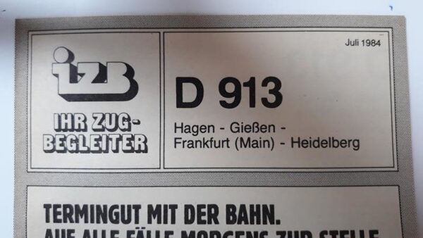 IZB D 910 Heidelberg-Dortmund Startseite Zuglaufschilder Besonderheiten Zugbegleiter Faltblatt vorhanden IZB D 910 Heidelberg-Dortmund Vorheriger Zuglaufschild IZB D 913 Hagen-Heidelberg Nächster Zuglaufschild IZB D 899 Hamburg-Stuttgart