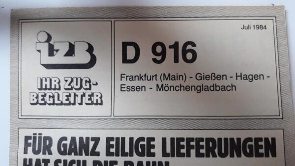 IZB D 912 Frankfurt(M)-Mönchengladbach Startseite Zuglaufschilder Besonderheiten Zugbegleiter Faltblatt vorhanden IZB D 912 Frankfurt(M)-Mönchengladbach Vorheriger Zuglaufschild IZB D 916 Frankfurt(M)-Mönchengladbach Nächster Zuglaufschild IZB D 911 Mönchengladbach-Stuttgart