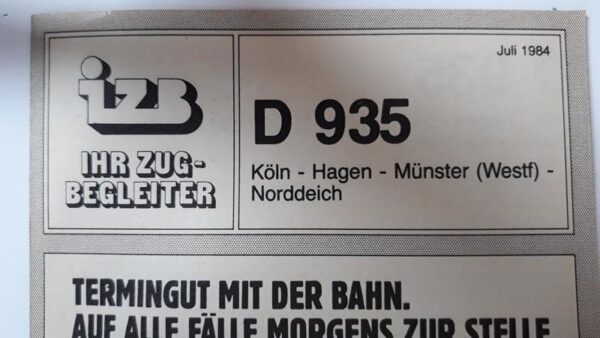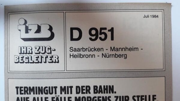 IZB D 950 Nürnberg-Saarbrücken Startseite Zuglaufschilder Besonderheiten Zugbegleiter Faltblatt vorhanden IZB D 950 Nürnberg-Saarbrücken Vorheriger Zuglaufschild IZB D 951 Saarbrücken-Nürnberg Nächster Zuglaufschild IZB D 935 Köln-Norddeich