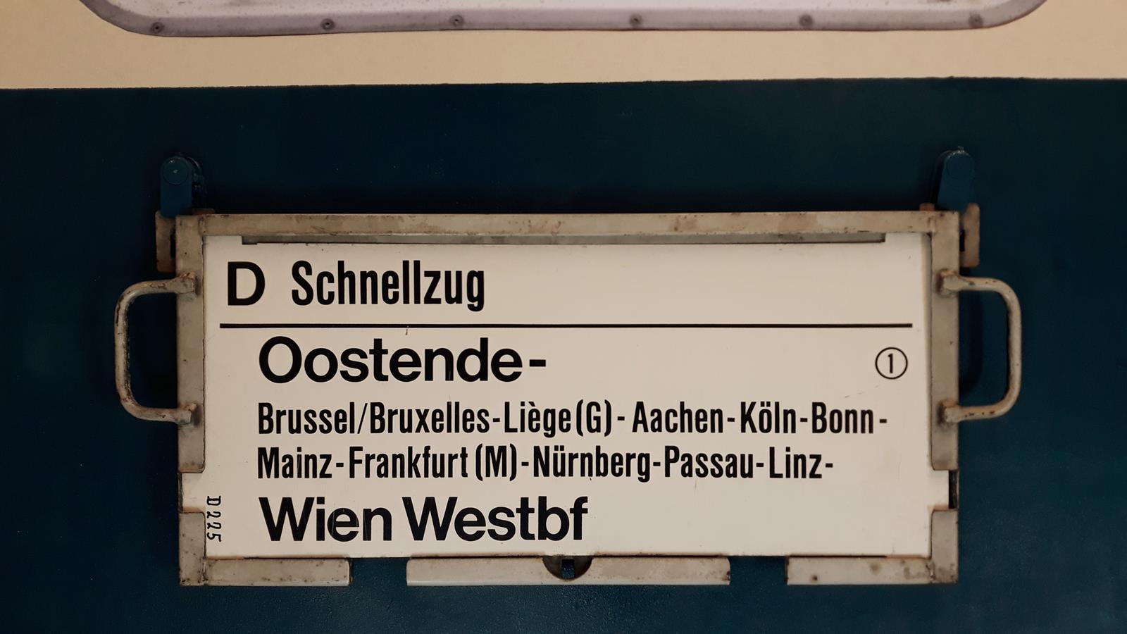 Dieses Schild wurde für den D 225 nach Wien verwendet,der aber sogar den Namen“ Oostende-Wien-Express“trug,der aber auf diesem Schild nicht aufgedruckt ist.