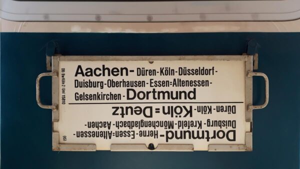 Dortmund-Köln=Deutz Startseite Zuglaufschilder Nahverkehr Nahverkehrszüge Dortmund-Köln=Deutz Ein Nahverkehrszug ,der über Herne,Duisburg,Aachen nach Köln-Deutz fuhr. Vorheriger Zuglaufschild Aachen-Dortmund Nächster Zuglaufschild Hannover-Celle