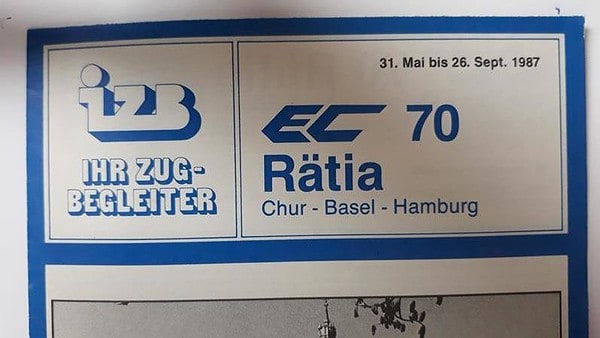 IZB EuroCity 71 Rätia Hamburg-Chur Startseite Zuglaufschilder Besonderheiten Zugbegleiter Faltblatt vorhanden IZB EuroCity 71 Rätia Hamburg-Chur Vorheriger Zuglaufschild IZB EuroCity 74 -75 Tiziano Hamburg-Milano-Hamburg Nächster Zuglaufschild IZB EuroCity 70 Rätia Chur-Hamburg
