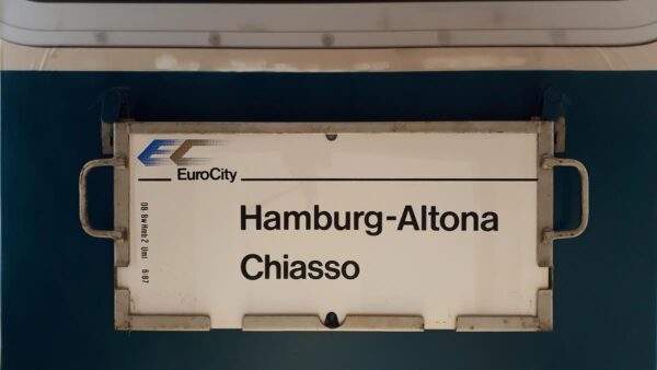 Im Einführungsjahr ist das ein Behelfsschild für alle EuroCity-Züge ab Chiasso ,es zeigt weder Zugname noch die Unterwegsbahnhöfe.Ein klassisches Behelfsschild