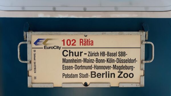 1994 startete dieser Zug um 7.40 Uhr in Dortmund Hbf und erreichte Chur in der Schweiz um 16.37 Uhr. Der Gegenzug EC 102 mit gleichen Namen startete um 8.23 Uhr in Chur und fuhr über Dortmund( Abfahrt Dortmund Hbf 17.27 Uhr) und erreichte sein Ziel Berlin Zoo um 22.40 Uhr-Beide Züge haben daher eine unterschiedliche Lauflänge.