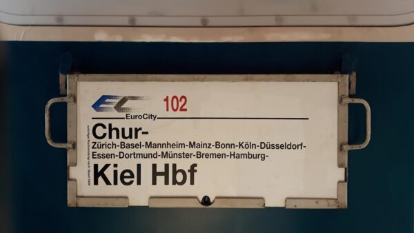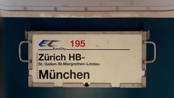 2003 stellte die Schweizerische Bundesbahn diesen namenlosen EuroCity.Man ging sorgsam mit diesen Zuglaufschildern um,denn auf der Seite des Schild war folgender Text aufgedruckt- „sofortige Rücksendung nach: Zürich 2852.“