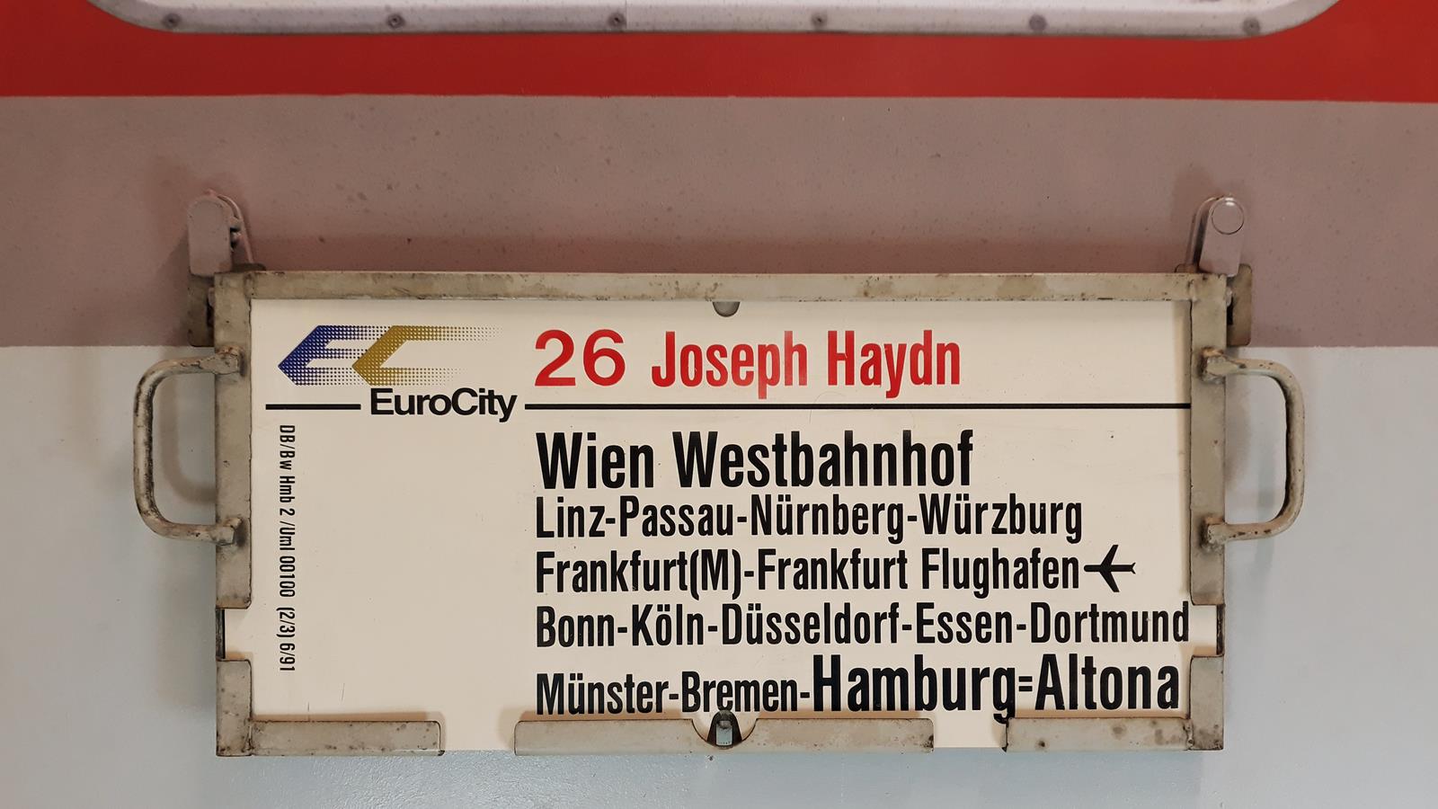 EuroCity 26 Joseph Haydn Wien Westbahnhof-Hamburg-Altona Startseite Zuglaufschilder Fernverkehr Euro City EuroCity 26 Joseph Haydn Wien Westbahnhof-Hamburg-Altona Das Betriebswerk Hamburg 2 stellte diesen Zug. Vorheriger Zuglaufschild IC 535 Käthe Kollwitz Kiel-Dresden Nächster Zuglaufschild EuroCity 27 Joseph Haydn Hamburg-Altona-Frankfurt(M)