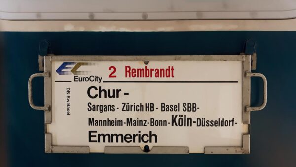 EuroCity 3 Rembrandt Emmerich-Basel Bad Bf Startseite Zuglaufschilder Fernverkehr Euro City EuroCity 3 Rembrandt Emmerich-Basel Bad Bf Das Betriebswerk Basel stellte diesen Zug. Vorheriger Zuglaufschild EuroCity 2 Rembrandt Chur-Emmerich Nächster Zuglaufschild EuroCity 24 Franz Liszt Budapest-Dortmund