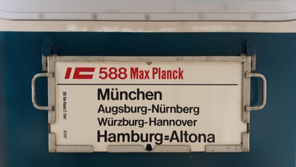 Der EuroCity „Merkur“ fuhr 1987 nicht über Hamburg-Altona,sondern machte den Fahrtrichtungswechsel im Hamburger Hauptbahnhof.Daher steht auf dem Zuglaufschild nur „Hamburg“ als Unterwegsbahnhof.