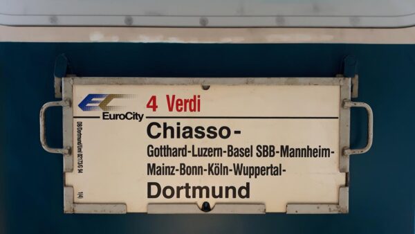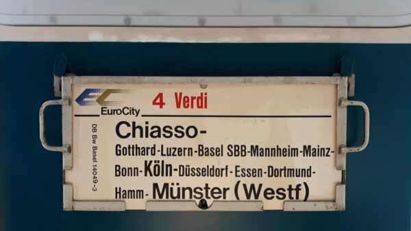 Vorheriger Zuglaufschild EuroCity 4 Verdi Chiasso-Dortmund