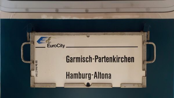 Dieses Ersatzzuglaufschild wurde 1987 nur für den EuroCity 80/81 Karwendel nach Innsbruck bereit gehalten, wenn das andere Zuglaufschild mit Zugnummer,Zugname und Unterwegshalten nicht verfügbar war.Für den Wagen der damals dieses Zuglaufschild führte,war die Fahrt aber schon in Garmisch-Partenkirchen zu Ende,der verbleibende Zugteil fuhr weiter nach Innsbruck.
