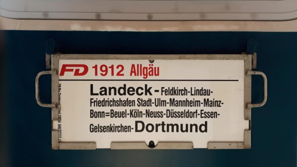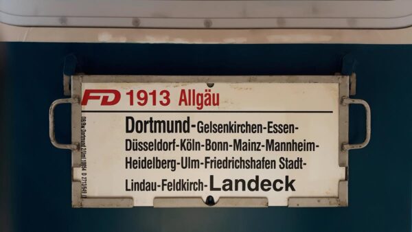 FD 1913 Allgäu Dortmund-Lindau Startseite Zuglaufschilder Fernverkehr FD-Züge Fern-Express FD 1913 Allgäu Dortmund-Lindau Dieser Kurswagen 1989 wurde in Ulm vom Hauptzug nach Oberstdorf getrennt. Vorheriger Zuglaufschild IC 513 Wetterstein Braunschweig-Mittenwald Nächster Zuglaufschild IC 691 Herkules Kassel-München