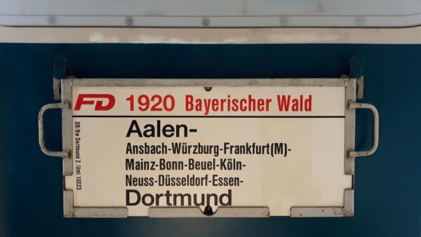 FD 1921 Bayerischer Wald Dortmund-Aalen Startseite Zuglaufschilder Fernverkehr FD-Züge Fern-Express FD 1921 Bayerischer Wald Dortmund-Aalen Ein Kurswagen 1986 ,der ab Würzbug nach Aalen fuhr. Vorheriger Zuglaufschild FD 1920 Bayerischer Wald Aalen-Dortmund Nächster Zuglaufschild FD 1902 Bodensee Konstanz-Münster