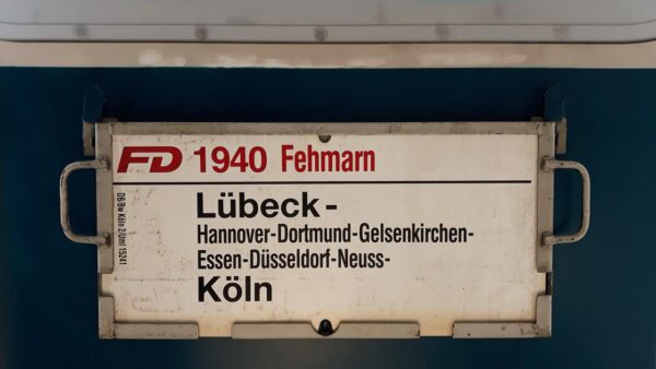 Dieser FD hatte einen Kurswagen der ab Lübeck nach Kiel fuhr,da das passende Schild nicht zur Verfügung stand,hat ein“guter Geist“ das neue Zielwort Kiel als Schablone ergänzt.