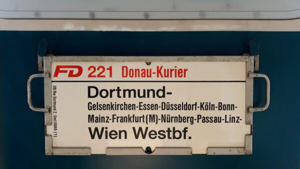 Der FD 264 Mozart fuhr auf der Stammstrecke von Wien nach Paris-Ein Schild vom Sommer 1987, gestellt vom Betriebswerk München