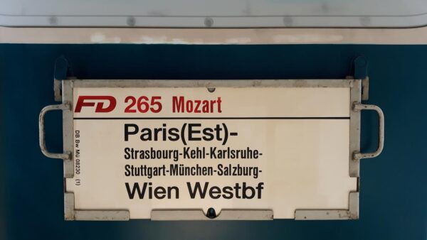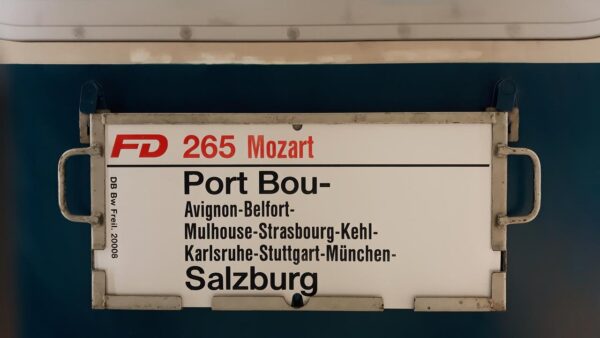 Der FD 264 Mozart als Stammstrecke von Wien nach Paris. Dieses Schild zeigt einen Kurswagen nach Port Bou, der aber erst Salzburg angehängt wurde. Ein Schild vom Sommer 1987, gestellt vom Betriebswerk Freilassing.
