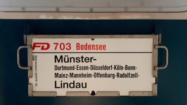 FD 703 Bodensee Münster-Konstanz Startseite Zuglaufschilder Fernverkehr FD-Züge Fern-Express FD 703 Bodensee Münster-Konstanz Das Betriebswerk Münster 1 stellte 1987 diesen Zug. Vorheriger Zuglaufschild FD 703 Bodensee Münster-Lindau Nächster Zuglaufschild EuroCity 96 Gottfried Keller München-Lindau