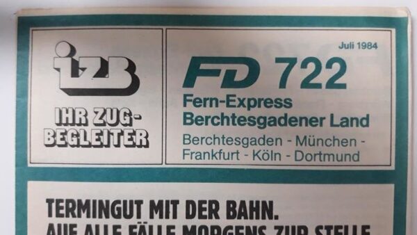 IZB FD 723 Berchtesgadner Land Dortmund-Berchtesgaden Startseite Zuglaufschilder Besonderheiten Zugbegleiter Faltblatt vorhanden IZB FD 723 Berchtesgadner Land Dortmund-Berchtesgaden Vorheriger Zuglaufschild IZB FD 770 Schwarzwald Konstanz-Hamburg Nächster Zuglaufschild IZB FD 722 Berchtesgadner Land Berchtesgaden-Dortmund