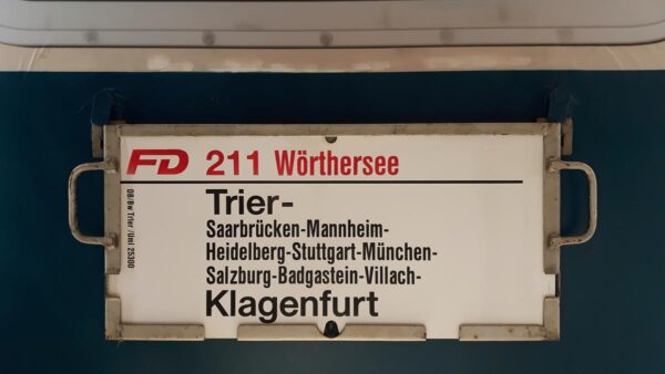 Dieses Zuglaufschild vom Bw Trier hat einen Richtigkeitsfehler. Dieser Kurswagen müsste FD 781 Königssee heissen.