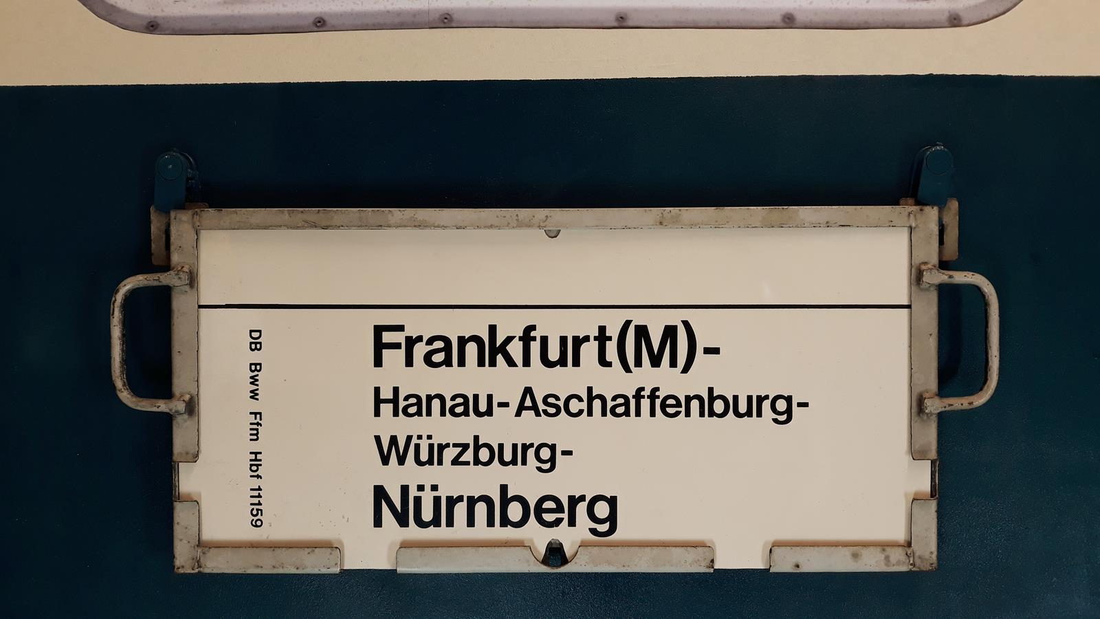 Vermutlich ein Schild für einen Verstärkerzug, der nur von Fankfurt bis Nürnberg fuhr, ohne Namen und ohne Zuggattung.