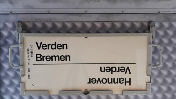 Hannover-Verden Startseite Zuglaufschilder Nahverkehr Nahverkehrszüge Hannover-Verden Das Betriebswerk Hannover stellte diesen Zug. Vorheriger Zuglaufschild Saarbrücken-Stuttgart Nächster Zuglaufschild Verden-Bremen