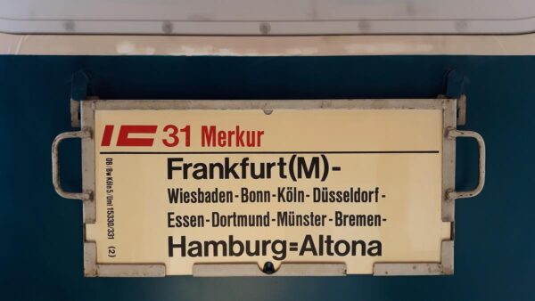 Kurios:Bei diesem Zuglaufschild ist der Zwischenhalt „München“ in einer anderen Schriftart gedruckt,vermutlich um den wichtigen Umsteigepunkt München hervorzuheben.