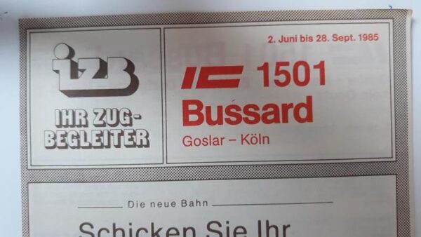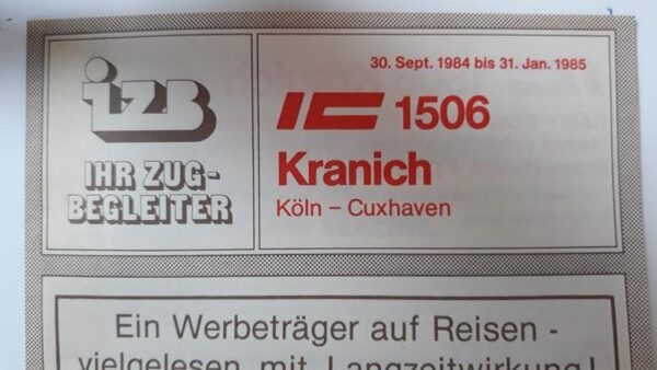 IZB IC 1504 Kranich Köln-Cuxhaven Startseite Zuglaufschilder Besonderheiten Zugbegleiter Faltblatt vorhanden IZB IC 1504 Kranich Köln-Cuxhaven Vorheriger Zuglaufschild IZB IC 1506 Kranich Köln-Cuxhaven Nächster Zuglaufschild IZB IC 1501 Bussard Goslar-Köln