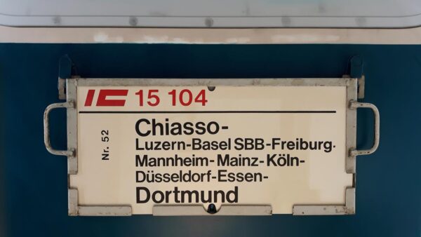 IC 15104 Basel SBB-Dortmund Startseite Zuglaufschilder Fernverkehr InterCity IC 15104 Basel SBB-Dortmund Ein Verstärkungswagen für einen IC -gestellt vom Betriebswerk Basel. Vorheriger Zuglaufschild IC 15104 Chiasso-Dortmund Nächster Zuglaufschild IC 1615 Gambrinus Dortmund-Ulm