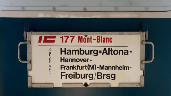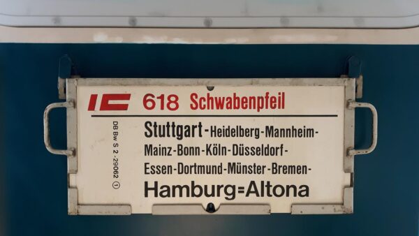 Es ist ein Zuglaufschild für einen Entlastungszug für den InterCity 170,ungewöhnlich ist,das beim Zielbahnhof der Zusatz „Altona“ fehlt.