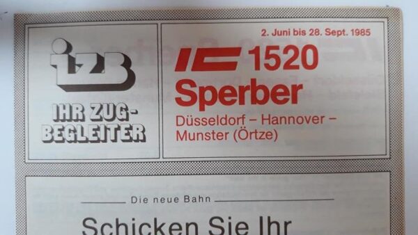 IZB IC 1519 Sperber Braunschweig-Düsseldorf Startseite Zuglaufschilder Besonderheiten Zugbegleiter Faltblatt vorhanden IZB IC 1519 Sperber Braunschweig-Düsseldorf Vorheriger Zuglaufschild IZB IC 1520 Sperber Düsseldorf-Munster(Örzte) Nächster Zuglaufschild IZB IC 1518 Seestern Koblenz-Hamburg