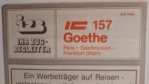 IZB IC 157 Paris-Frankfurt(M) Startseite Zuglaufschilder Besonderheiten Zugbegleiter Faltblatt vorhanden IZB IC 157 Paris-Frankfurt(M) Vorheriger Zuglaufschild IZB IC 162 Bavaria München-Zürich Nächster Zuglaufschild IZB IC 157 Goethe Paris-Frankfurt(M)