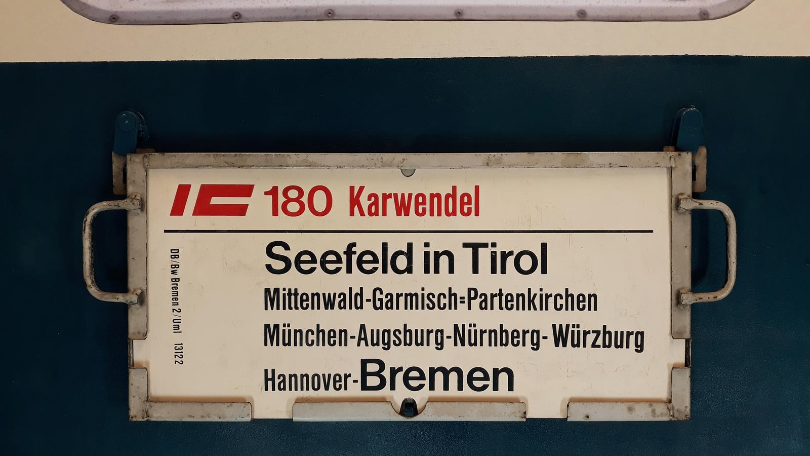 IC 180 Karwendel Seefeld in Tirol-Bremen Startseite Zuglaufschilder Fernverkehr IC 180 Karwendel Seefeld in Tirol-Bremen Das Betriebswerk Bremen stellte 1981 diesen internationalen Reisezug. Vorheriger Zuglaufschild Heilbronn-Germersheim Nächster Zuglaufschild Donau-Kurier Dortmund-Pfarrkirchen