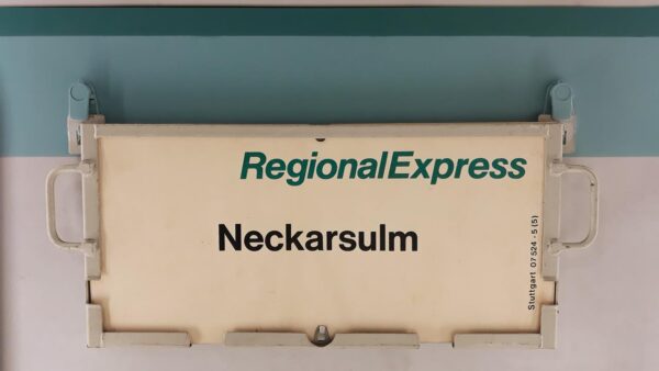 Ein Zuglaufschild aus dem Jahr 1986;ungewöhnlich ist der kleine Schreibfehler, denn der Zug fuhr zunächst in den Sackbahnhof Frankfurt(M) und dann zum Flughafen,der auf diesem Schild als Ffm-Frankfurt und dem Flugzeug aufgedruckt wurde. Das war dann offenbar Zuviel Frankfurt, egal ob ausgeschrieben oder als Kürzel FfM. Daher wurde das Kürzel weggeschliffen.