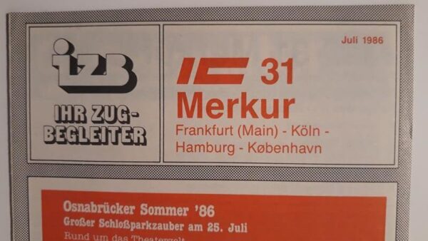 Startseite Zuglaufschilder Besonderheiten Zugbegleiter Faltblatt vorhanden IZB IC 30 Merkur Kopenhagen-Frankfurt(M)
