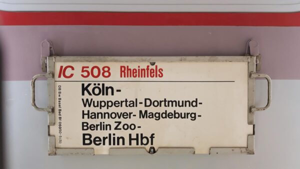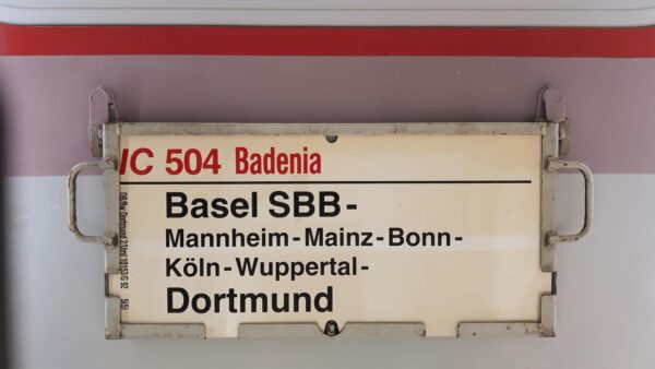 IC 505 Badenia Dortmund-Basel SBB Startseite Zuglaufschilder Fernverkehr InterCity IC 505 Badenia Dortmund-Basel SBB 1992 fuhr dieser Zug von Dortmund nach Basel SBB. Vorheriger Zuglaufschild IC 508 Rheinfels Köln-Berlin Hbf Nächster Zuglaufschild IC 504 Badenia Basel SBB-Dortmund