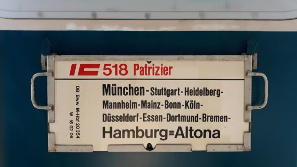 IC 519 Patrizier Hamburg=Altona-München Startseite Zuglaufschilder Fernverkehr InterCity IC 519 Patrizier Hamburg=Altona-München Das Bahnwagenwerk München Hbf stellte 1985 diesen Zug. Vorheriger Zuglaufschild Triol-Express Innsbruck-Helsingør Nächster Zuglaufschild IC 518 Patrizier München-Hamburg=Altona
