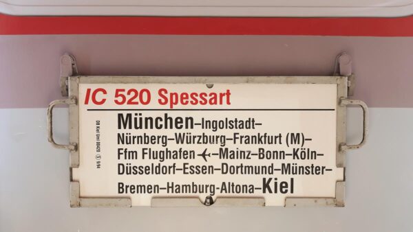 1994 fuhr dieser Zug täglich außer am Sonntag von München nach Kiel,am Sonntag begann seine Fahrt erst in Nürnberg,daher wurde dieses Zuglaufschild benötigt.