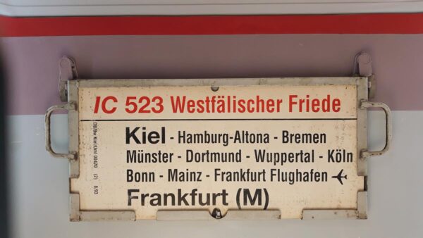 Das Betriebswerk Kiel stellte 1993 diesen Zug.Dieses Zuglaufschild wurde 1993 nur am Sonntag benötigt,denn am Sonntag fuhr dieser Zug um 10.48 Uhr ab Frankfurt am Main.