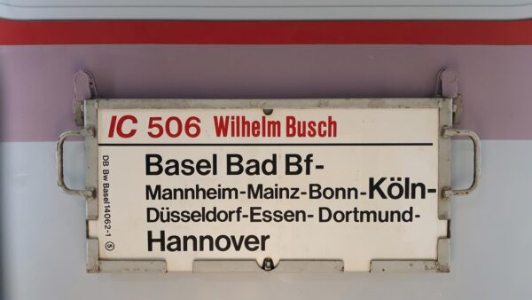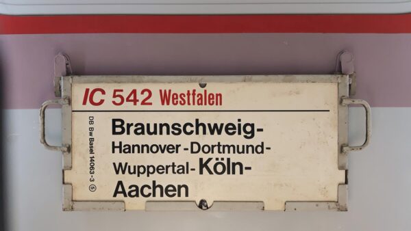 IC 543 Westfalen Aachen-Braunschweig Startseite Zuglaufschilder Fernverkehr InterCity IC 543 Westfalen Aachen-Braunschweig Dieser Zug fuhr 1991 nur von Montag bis Samstag. Vorheriger Zuglaufschild IC 542 Westfalen Braunschweig-Aachen Nächster Zuglaufschild IC 506 Wilhelm Busch Basel Bad Bf-Hannover