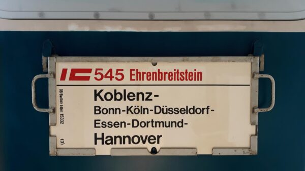 IC 545 Rheinland Frankfurt(M)-Hannover Startseite Zuglaufschilder Fernverkehr InterCity IC 545 Rheinland Frankfurt(M)-Hannover Im Sommer 1982 verband dieser Zug Frankfurt/M mit Hannover. Vorheriger Zuglaufschild IC 547 Niedersachsen Frankfurt(M)-Hannover Nächster Zuglaufschild IC 545 Ehrenbreitstein Koblenz-Hannover